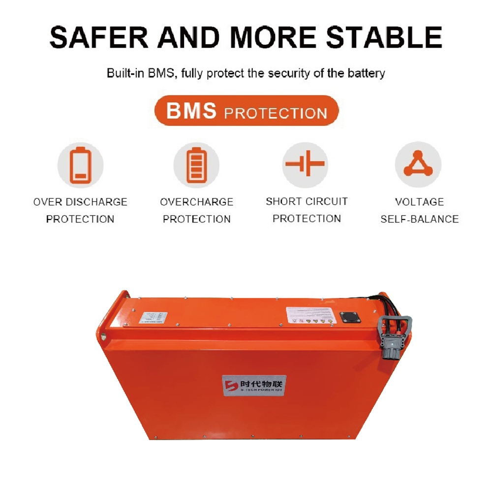 Upgrade your material handling equipment with our smart lithium battery packs. Designed to support a wide spectrum of voltages (25.6V, 48V, 51.2V, 73.6V), these units combine high-capacity cells with an intelligent Battery Management System (BMS) controller to eliminate compatibility issues, providing "plug-and-play" reliability across various forklift brands.